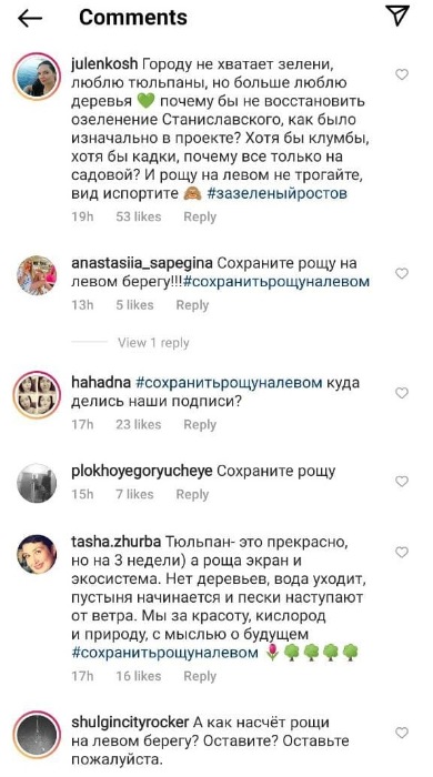 Несмотря на блокировку, люди продолжают высказываться в комментариях к посту против вырубки рощи. Отметим, что почти все комментарии посвящены этой теме, появился даже хештег #сохранитьрощуналевом.