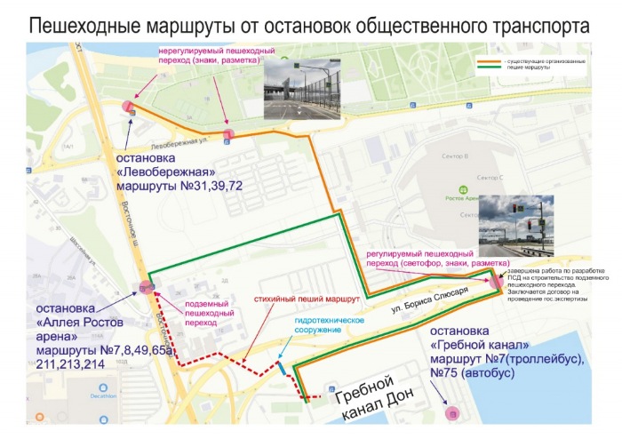 Пешеходная доступность от остановки общественного транспорта на ул. Левобережная до гребного канала “Дон” обеспечивается по тротуарам по ул. Левобережной и ул. Бориса Слюсаря. Переход через проезжие части осуществляется по пешеходным переходам в районе остановки “Городской пляж” и “Акватория”.